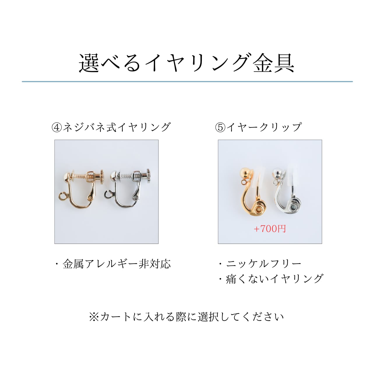 ⑤イヤークリップ:ニッケルフリー、痛くないイヤリング、+700円