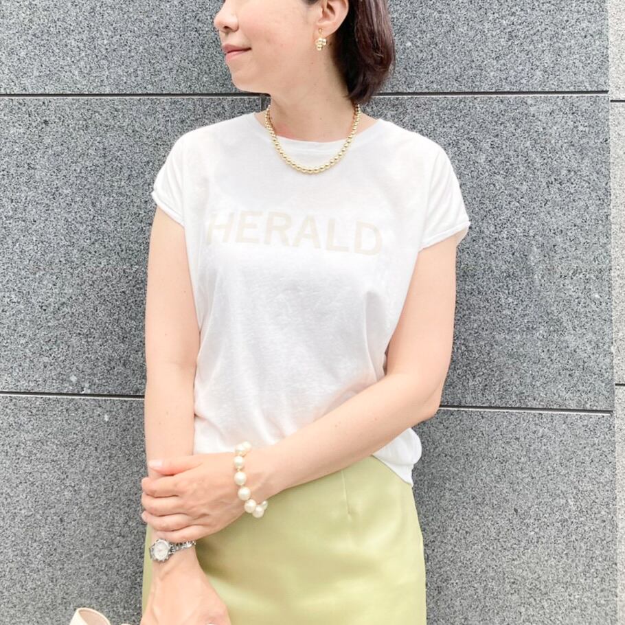 Tシャツやニットに合わせると、メタリックの硬質な輝きがコーデのアクセントに。
