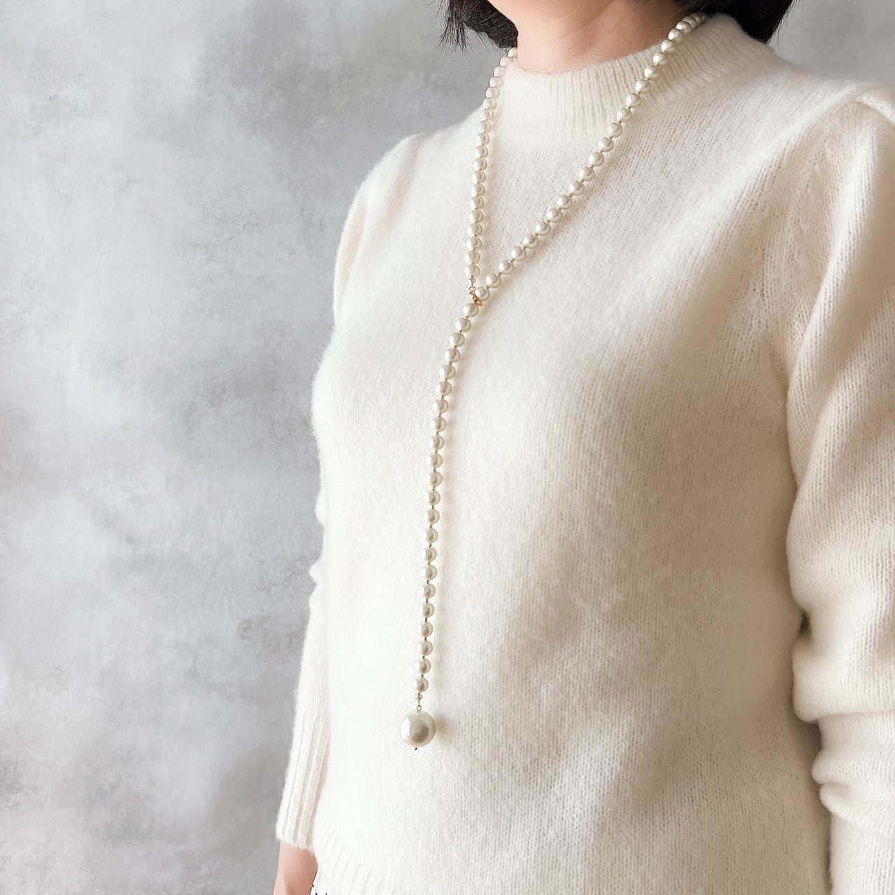 ロングネックレスは、大粒コットンパールを前にしてペンダントトップとしても、後ろにしてシンプルなネックレスとしてもお使いいただけます。