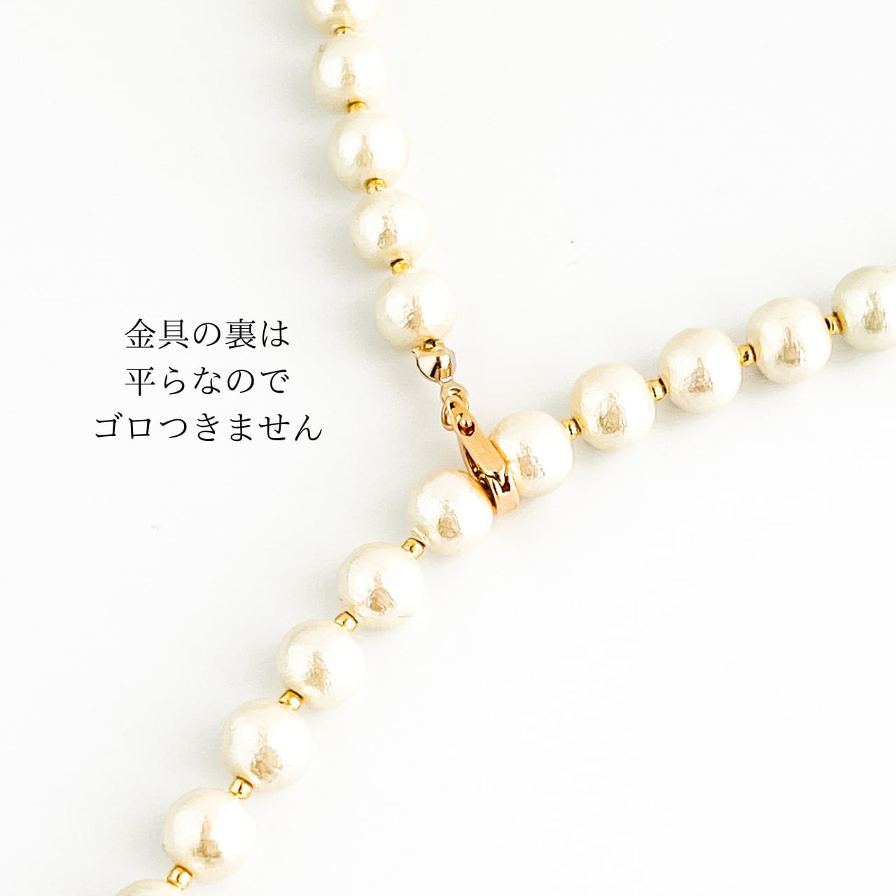 アルファベットDの形をした金具は、パールとパールの間の好きな位置で留めることができます。